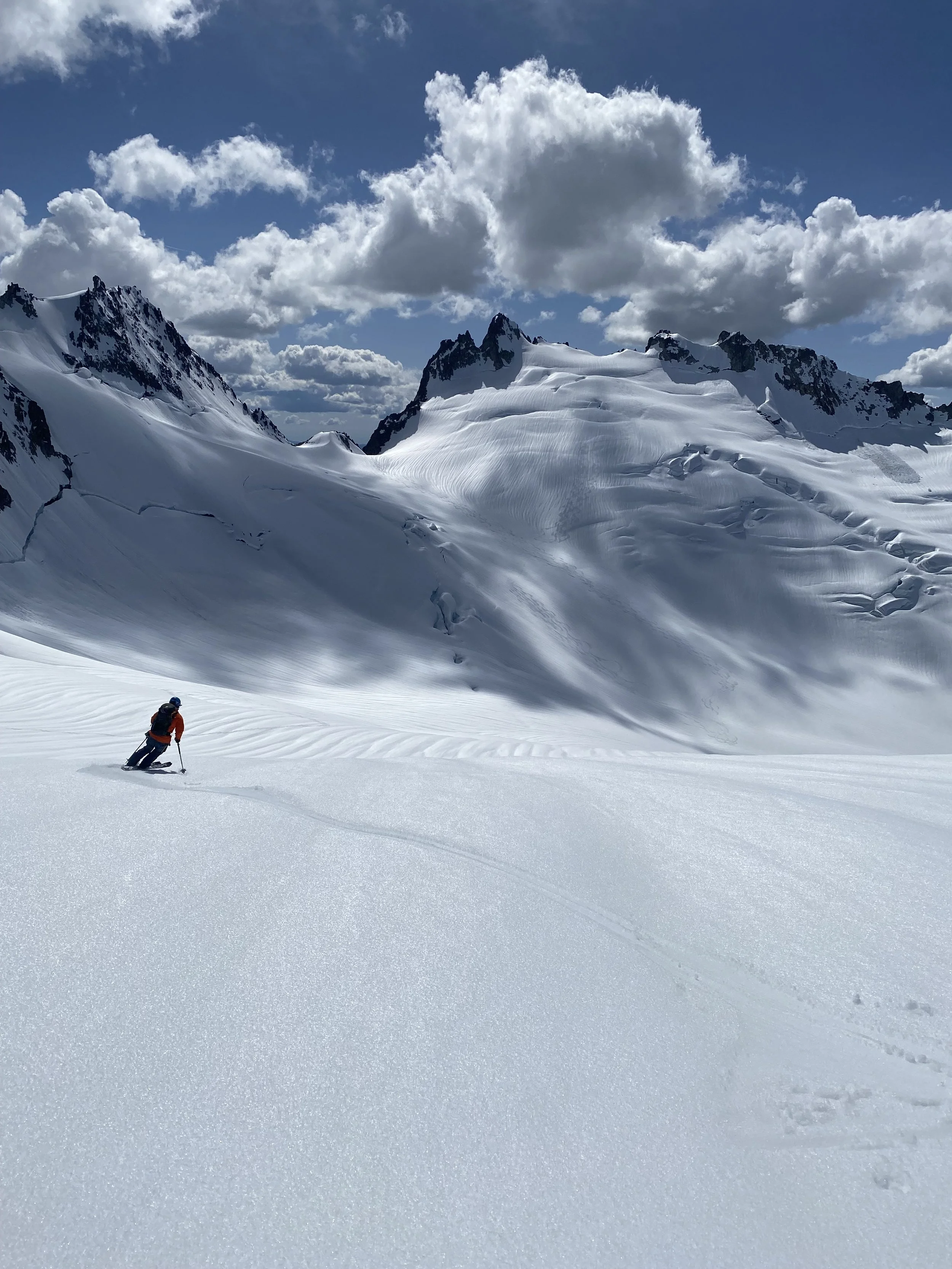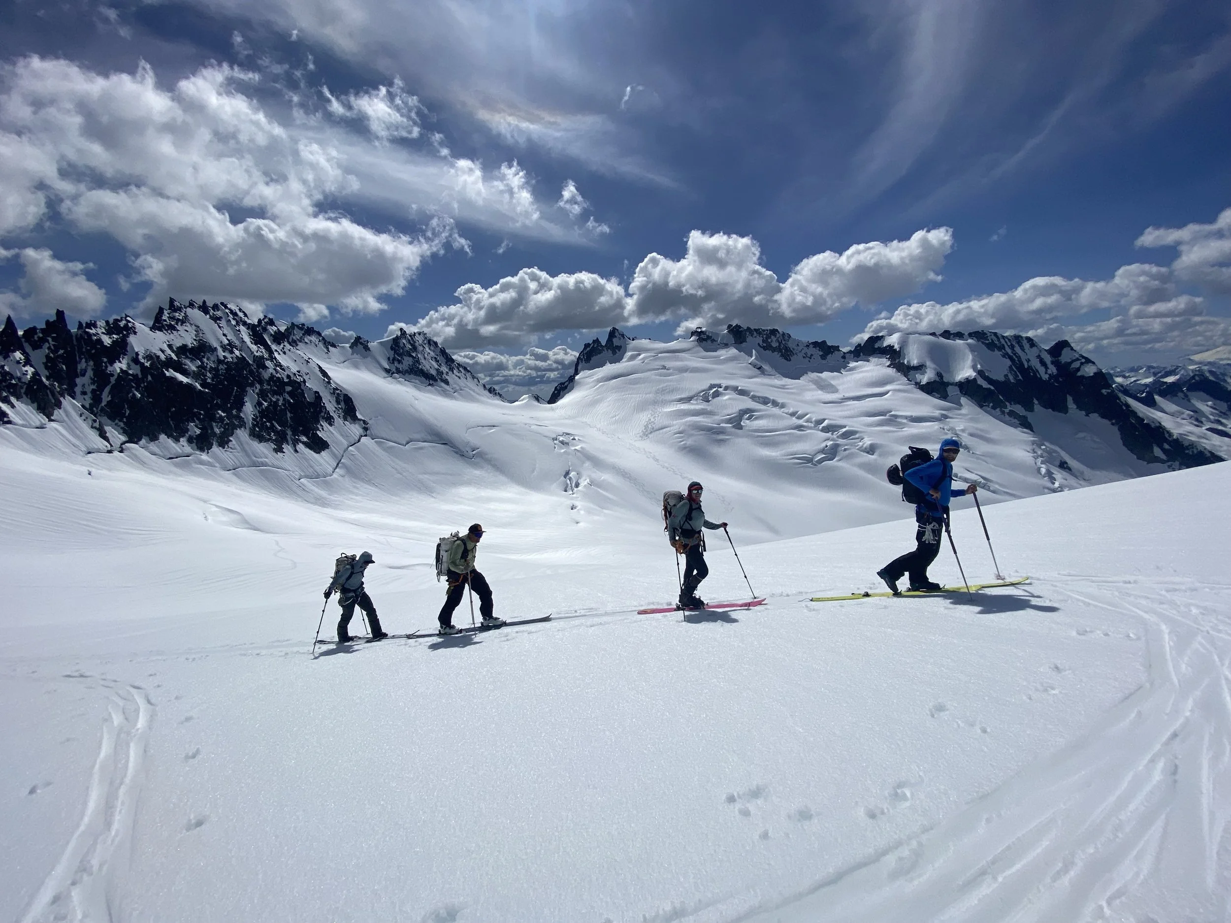 Over the course of the traverse, the route links together long, aesthetic descents with sustained climbs and complex alpine travel, crossing more than a dozen glaciers along the way. The skiing is often direct and engaging, with classic fall-line descents that reward efficient movement and confident technique. Days are long and committing, and route-finding, weather assessment, and snowpack evaluation play a critical role in daily decision-making.
